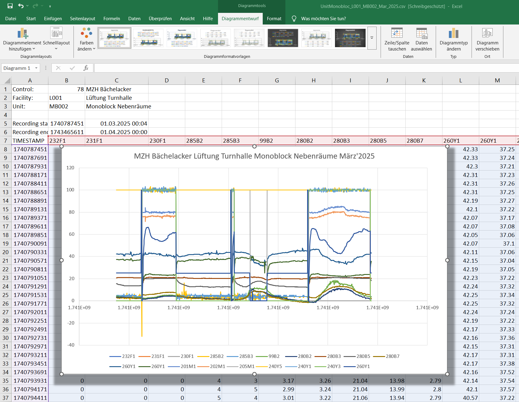 Jede Baugruppe speichert sämtliche Betriebsdaten in einer .csv Datei, die täglich erweitert und in gewünschtem Intervall abgeschlossen wird.